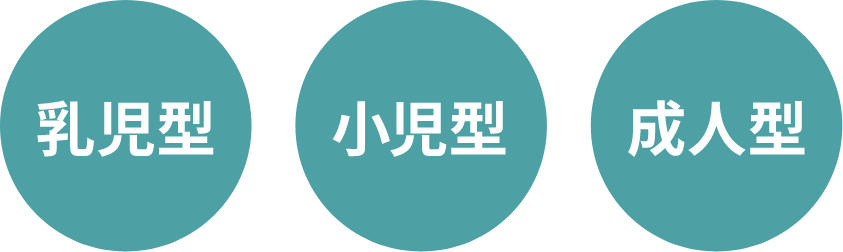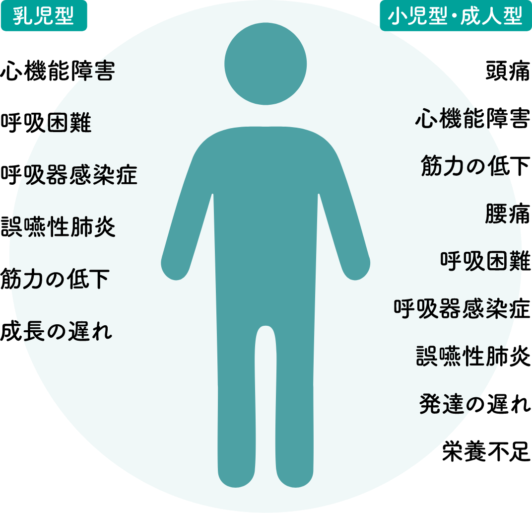 ポンぺ病は発症時期と病気の進行によって大きく分けて3つのタイプがあります。