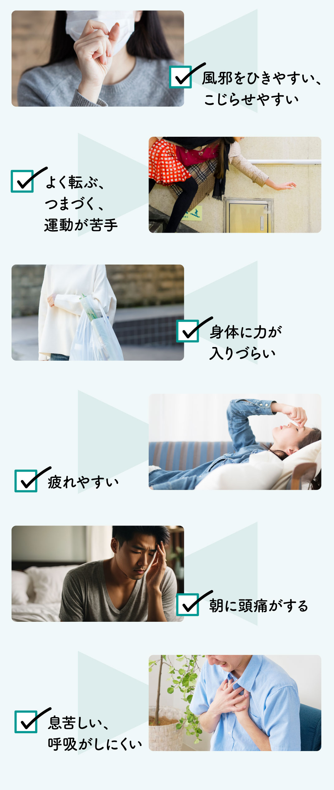 原因がわからず、ひとつでも上記のような症状に悩まれる方は下記をご覧ください。